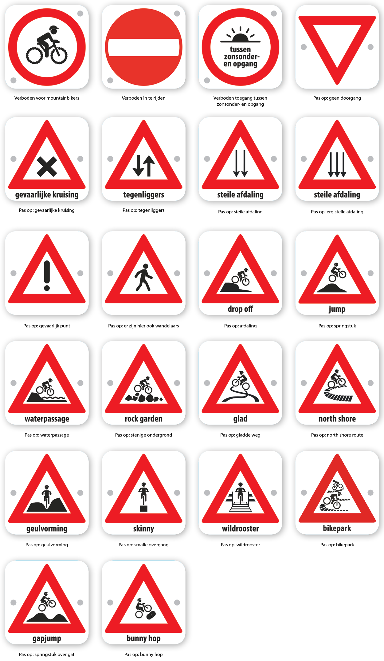 Binnen het Mountainbikenetwerk zijn er verschillende variaties van bordjes om mountainbikers te waarschuwen. Naast de standaardbebording kun je onderweg ook bepaalde gebods- en verbodsborden tegenkomen. Waar verbodsborden onmiskenbaar duidelijk maken wat niet mag, geven gebodsborden duidelijke instructies over hoe je je correct moet gedragen.